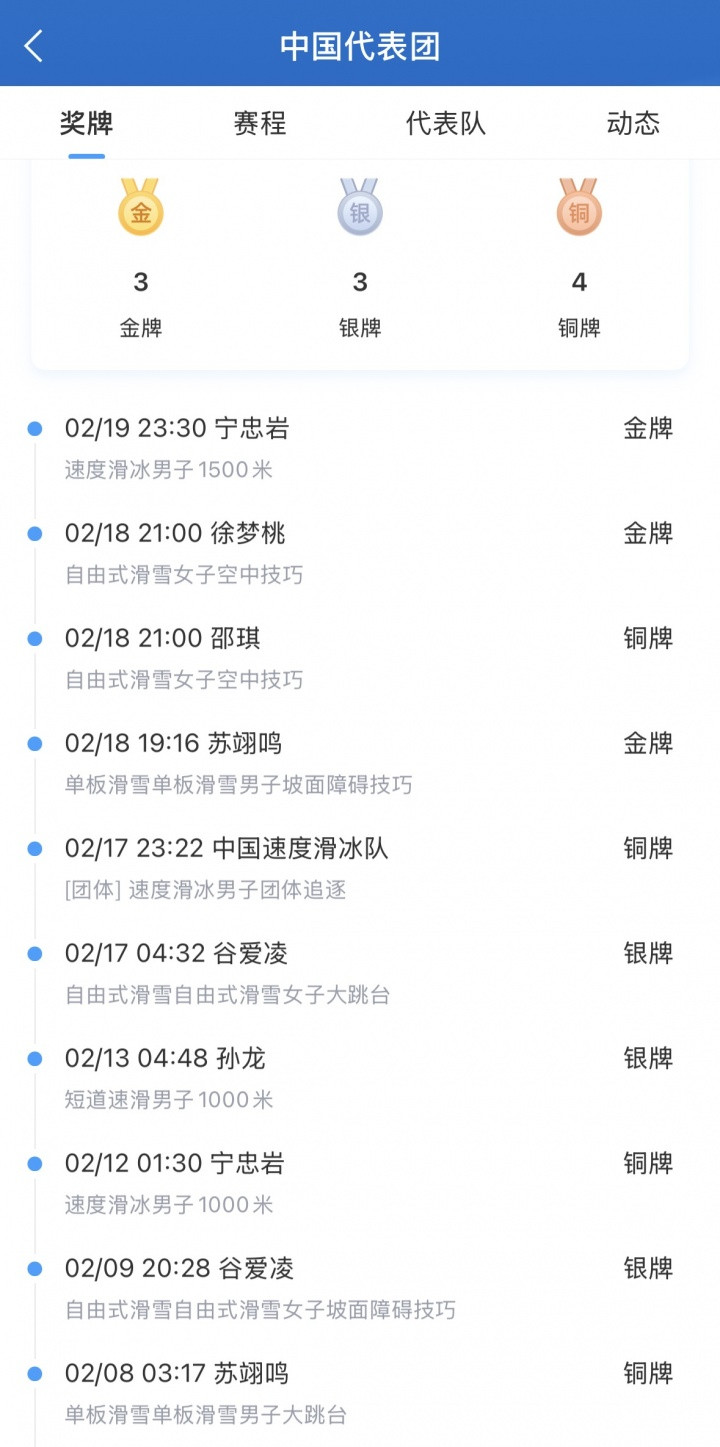 本届冬奥会中国队目前10枚奖牌如下:
