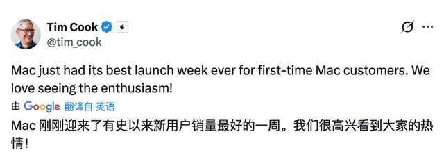 【TechWeb】3月21日消息,苹果公司CEO蒂姆·库克正式官宣,苹果新款Mac系列机型首周销售表现创下历史新高,迎来史上针对首次购机用户的最佳首周销售成绩,刷新Mac上市首周新用户纪录,